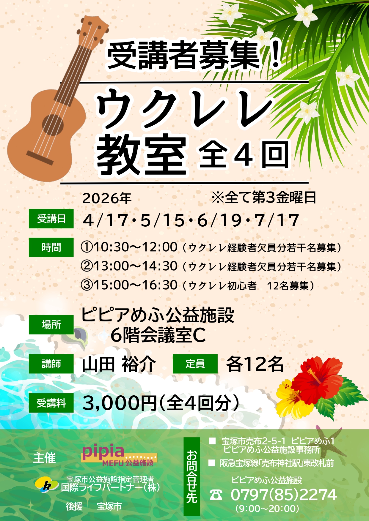 ①10:30~12:00(ウクレレ経験者欠員分若干名募集) ②13:00~14:30(ウクレレ経験者欠員分若干名募集) ③15:00~16:30(初心者向け)