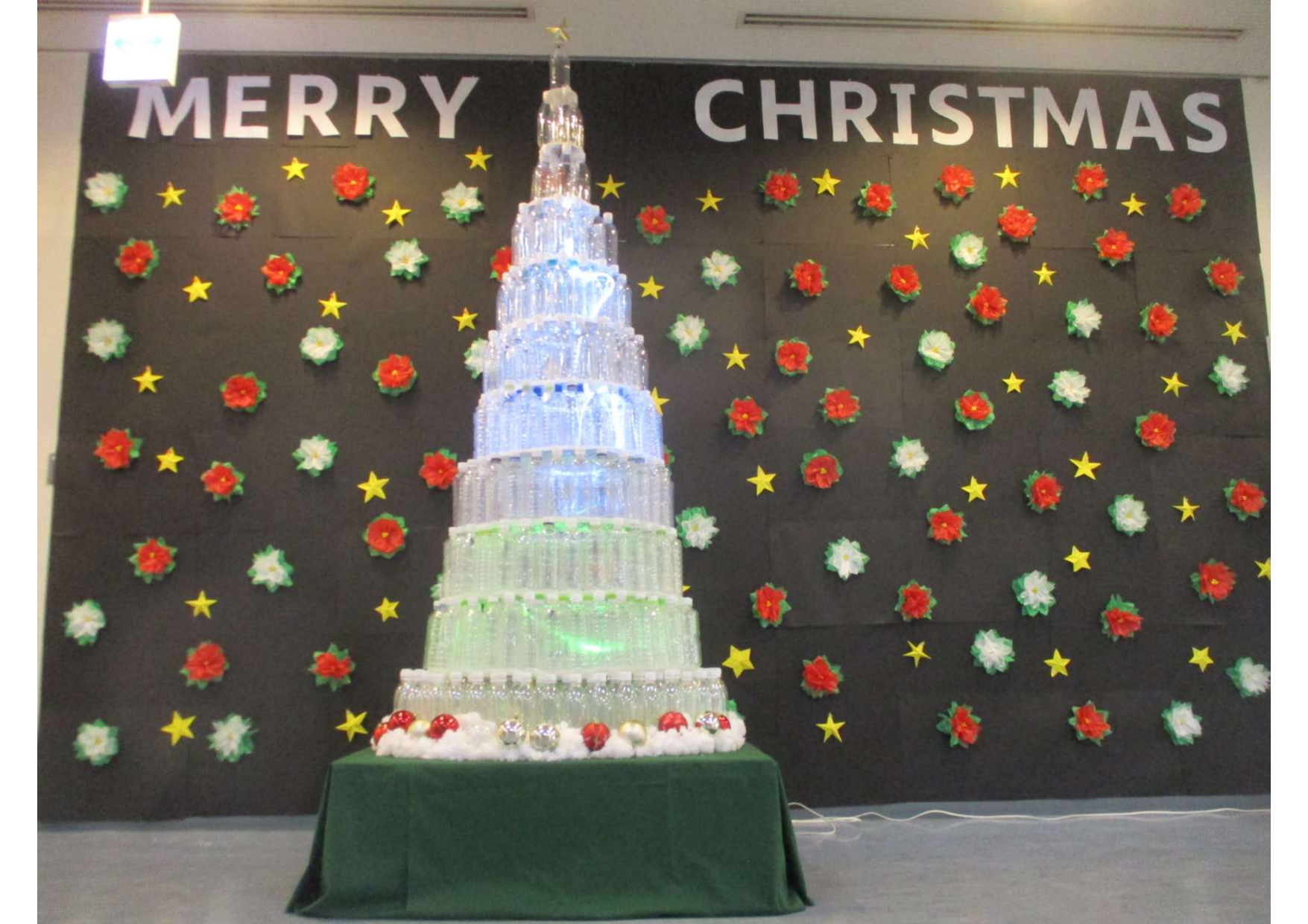 このクリスマスツリーは、宝塚市立西谷中学校のみなさんと宝塚市役所の職員のみなさんにご協力いただき、集まったペットボトルのうち 484本を使用して、ピピアめふ公益施設スタッフが制作しました。今回は、 11段の大きなツリーとなりました。ペットボトルを再利用することで、環境にもやさしいクリスマス飾りになっています。